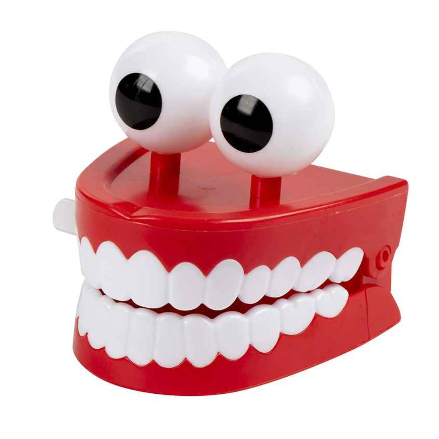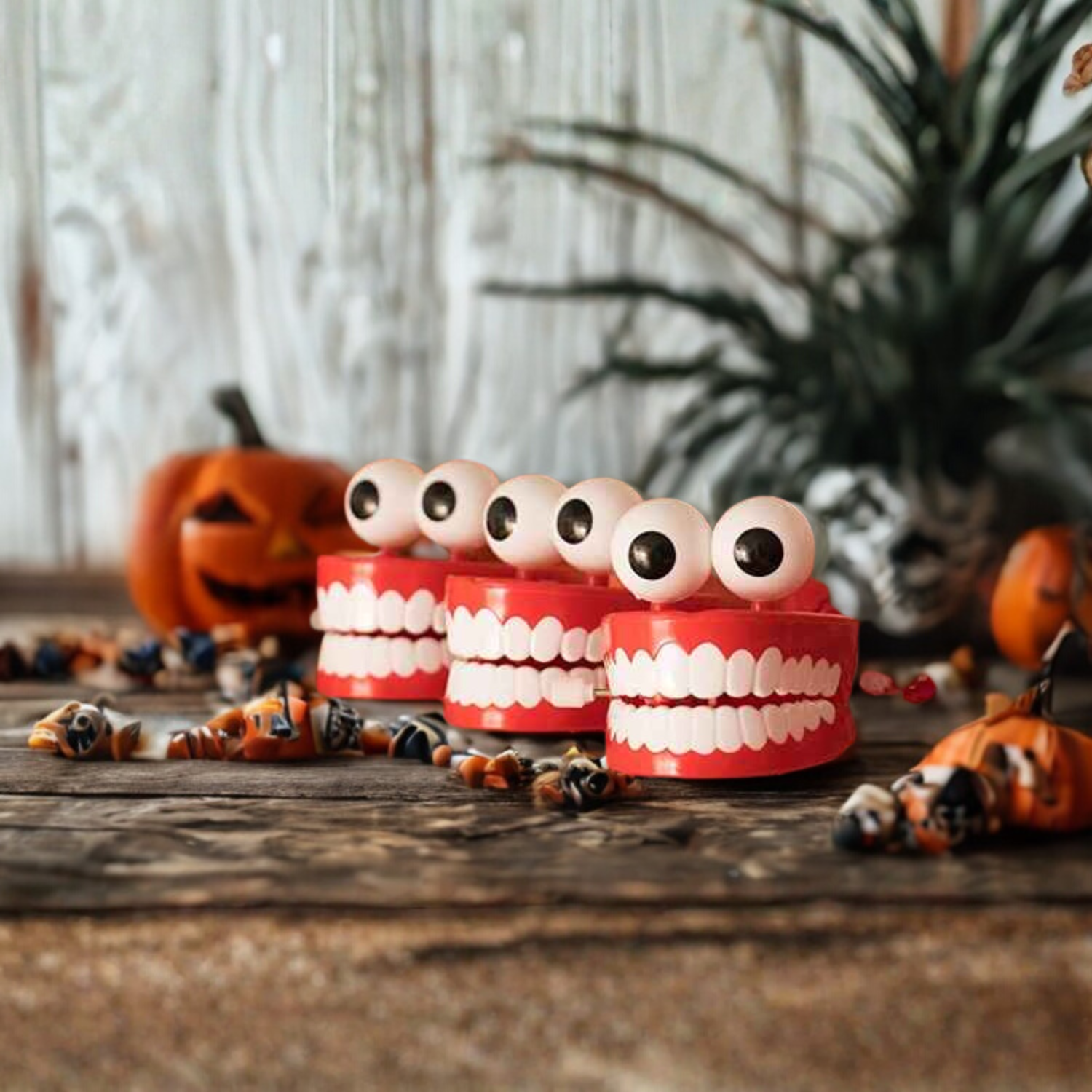 Al girar su mecanismo, los dientes comienzan a brincar y vibrar sin parar, sacando risas a niños y adultos. Su diseño colorido y expresivo lo convierte en un accesorio ideal para decorar mesas o complementar tus fiestas con un toque de humor espeluznante.