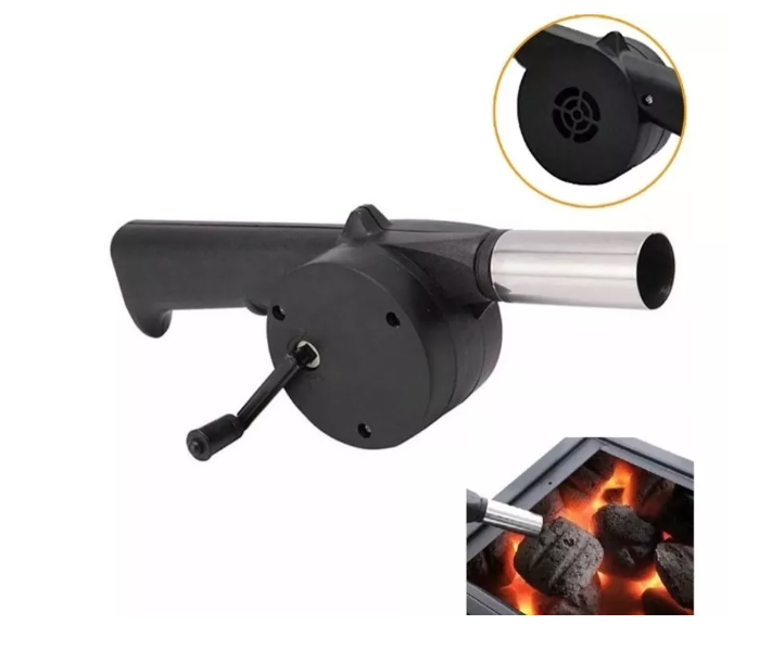 Soplador de carbón de manivela marca Expert Grill. Artículo nuevo, sellado, material polipropileno y aluminio, medida 24 cm, brazo de la manivela y cuello desmontable, posee asa en el mango para colgar. Color negro.